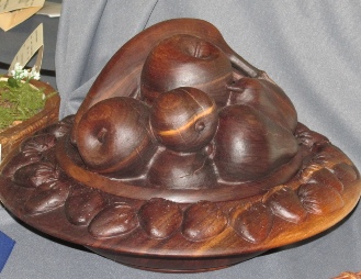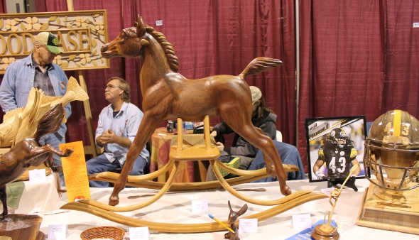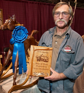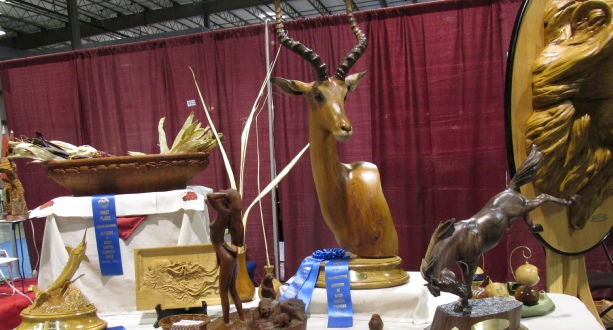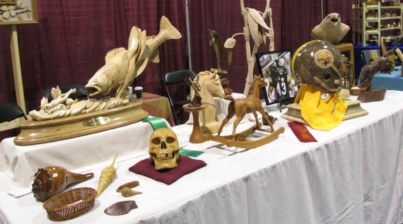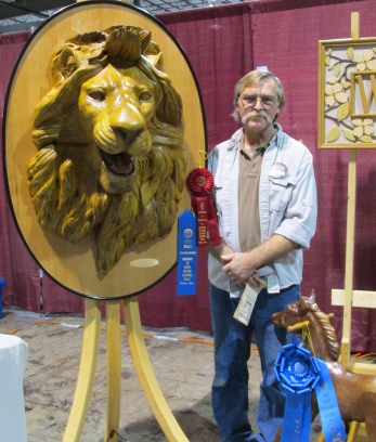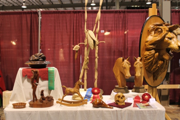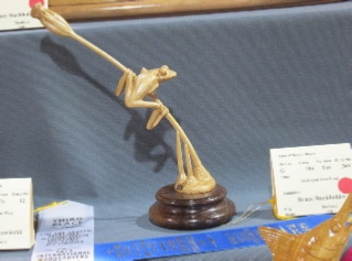 Bruce entered nine carvings in the Iowa show. Bruce and seven pieces can be seen in this one photo.